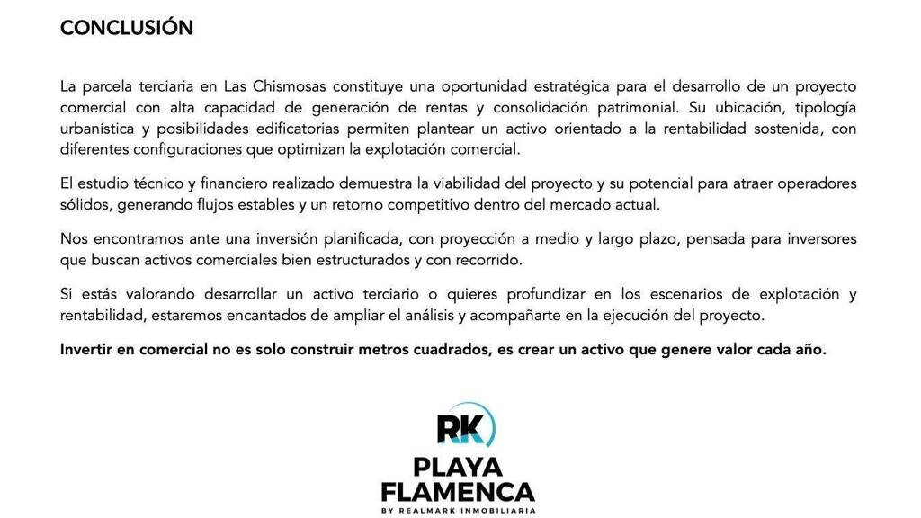 Gewerbegrundstück in Las Chismosas - Gewerbeprojekt mit 7,49 % Bruttorendite pro Jahr. . Wir präsentieren eine strategische Investitionsmöglichkeit auf einem städtischen Grundstück mit tertiärer Nutzung in der Calle Gorrión, Las Chismosas (Orihuela Costa), einem etablierten Wohngebiet mit hoher Dichte an dauerhaften und internationalen Bewohnern - ideal für gewerbliche Nutzung.. . Das Grundstück umfasst 1.206,96 m2 mit einer bebaubaren Fläche von bis zu 587 m2 und ist für die Entwicklung von drei Gewerbeeinheiten mit optionalem Untergeschoss vorgesehen, geeignet für Büro, Akademie, Gastronomie oder andere mit der tertiären Nutzung kompatible Aktivitäten.. . Wesentliche Projektdaten. . Städtebauliche Einstufung: Urbanes Bauland - Tertiär. Bebaubare Fläche: 587 m2. Geplantes Projekt: 3 Gewerbeeinheiten. . Einheit A: 80 m2. Einheit B: 170 m2. Einheit C: 250 m2. . Vorentwurf, technische Planung sowie 3D-Visualisierung sind in der Machbarkeitsstudie enthalten.. . Wirtschaftlichkeitsanalyse und Rendite. . Geschätzte Gesamtinvestition: 1.090.000 € . . Grundstück: 250.000 €. Baukosten: 770.800 €. Technisches Projekt: 45.000 €. Genehmigungen: 28.000 €. . Erwartete Mieteinnahmen:. 6.800 €/Monat. 81.600 €/Jahr. . Geschätzte Bruttojahresrendite: 7,49 %. Voraussichtliche Amortisationsdauer: zwischen 13 und 14 Jahren. . ( Steuern nicht inbegriffen). . Strategischer Ansatz. . Dieses Projekt ist nicht nur als Bauträgermaßnahme konzipiert, sondern als Entwicklung eines gewerblichen Anlageobjekts mit optimiertem, wiederkehrendem Cashflow und mittel- bis langfristigem Wertsteigerungspotenzial.. . Die Lage in einem konsolidierten Wohnumfeld, nahe wichtiger Verkehrsachsen und Dienstleistungen, begünstigt die Gewinnung stabiler Betreiber und mittel- bis langfristiger Mietverträge, wodurch die Volatilität reduziert und die Stabilität des Objekts gestärkt wird.. . Investitionschance. . Es handelt sich um eine strukturierte Investition mit vorangegangener städtebaulicher, technischer und finanzieller Analyse, geeignet für Investoren, die suchen:. . Gut dimensionierte Gewerbeimmobilien. Renditen über traditionellen Anlageformen. Regelmäßige Einnahmen. Vermögensaufbau an der Costa Blanca. . Wenn Sie die Entwicklung einer tertiären Immobilie in Orihuela Costa in Erwägung ziehen oder weitere Informationen zu Finanzszenarien, steuerlicher Optimierung oder Bewirtschaftungsstrategie wünschen, begleiten wir Sie gerne durch den gesamten Prozess.. . In Gewerbe zu investieren bedeutet nicht nur Quadratmeter zu bauen, sondern ein Objekt zu schaffen, das Jahr für Jahr Wert generiert.. . Preis: 250.000 €. Steuern und Kaufnebenkosten nicht inbegriffen (gemäß geltender Vorschriften). Maklerprovision für den Käufer im Verkaufspreis enthalten. Eine detaillierte Aufstellung zusätzlicher Kosten wird vor der Reservierung zur Verfügung gestellt.