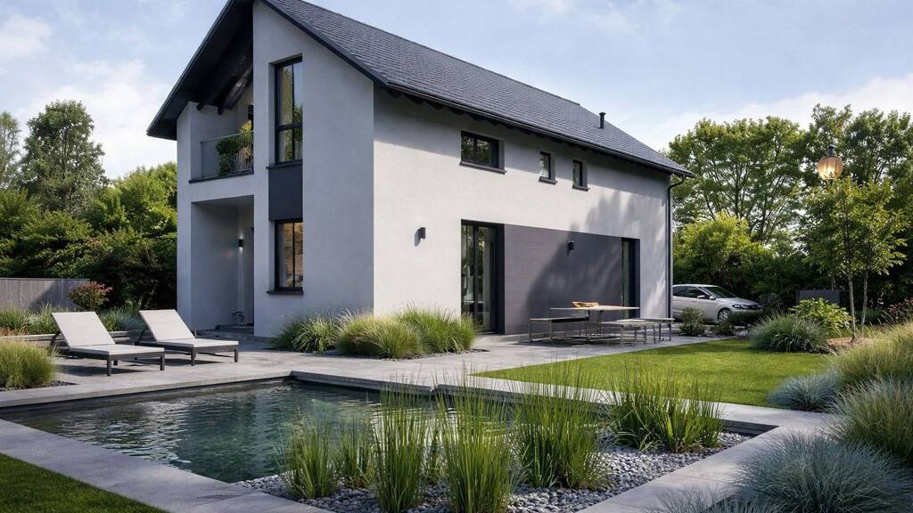DESIGN 2: Durchdachte Architektur für Familien. Dieses Konzept überzeugt durch eine klare Trennung von Wohn- und Ruhebereichen. Erdgeschoss: Repräsentative Diele, offener Wohn-Ess-Kochbereich mit direktem Zugang zur überdachten Terrasse. Inklusive HWR und Gäste-WC. Obergeschoss: Großzügiges Elternschlafzimmer (16 m²) mit privater Loggia. Zwei geräumige Kinderzimmer vervollständigen das Raumangebot und bieten viel Flexibilität.