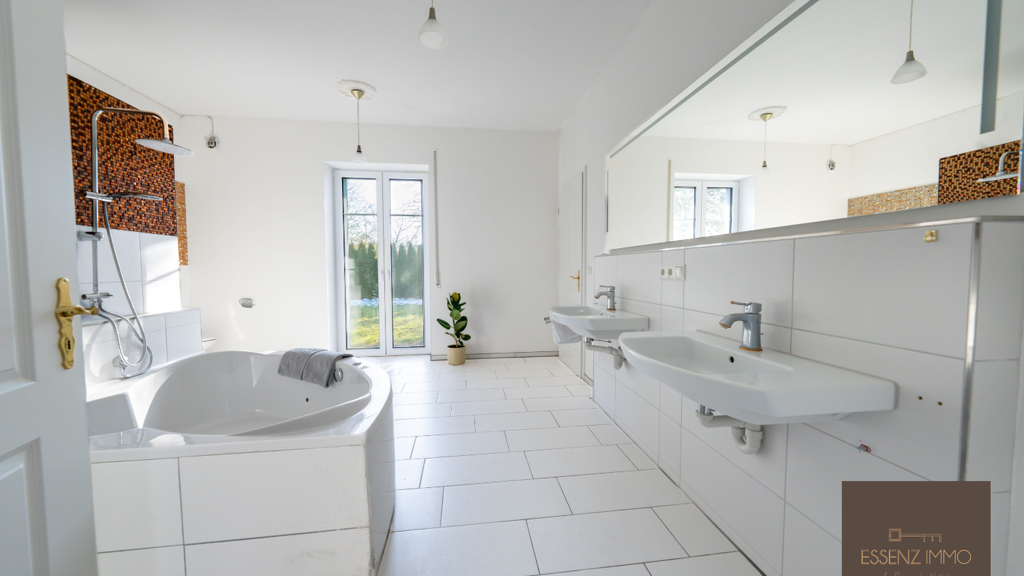 - Hauptbadezimmer mit Badewanne, 2 Waschbäcken, begehbarer Dusche, Bidet und Toilete, Waschmaschinenanschluß & direktem Gartenzugang