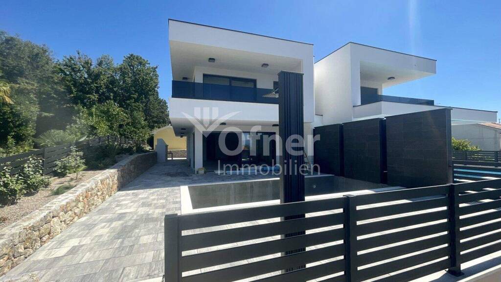 Doppelhaushälfte in Meeresnähe in attraktiver Lage umfasst 268 m2 und besteht aus Wohnzimmer, Küche, Esszimmer, Abstellraum, Toilette im Erdgeschoss und vier Schlafzimmern, drei Badezimmern im ersten Stock. Die großzügigen Terrassen bieten Blick auf das Meer und die Stadt Rijeka. Das Haus wird mit hochwertigen Materialien und Geräten gebaut und ausgestattet. Die Fußbodenheizung wird mit Klimaanlagen zur Raumheizung und -kühlung kombiniert. Der Garten wird über einen Swimmingpool, eine Sonnenterrasse, eine Außendusche und einen Grillplatz verfügen. Zu einem der schönsten Strände der Insel Krk (Njivice) sind es nur 200 m und zum Stadtzentrum 400 m.