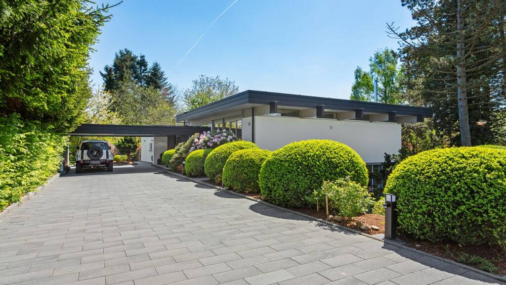 Dieses außergewöhnliche Architektenhaus liegt in einer unverbaubaren Ortsrandlage. Charakteristisch sind die beiden versetzt angeordneten Flachdachbaukörper, die sich harmonisch in die Topografie des nach Süden ausgerichteten Grundstücks einfügen und einen unverstellten Blick in die umliegende Landschaft eröffnen. Großzügige, bodentiefe Drei-Scheiben-Fenster sowie Schiebetürelemente in Kombination mit durchdachten Lichtbändern sorgen aus nahezu jedem Bereich des Hauses für fließende Übergänge nach draußen und ein dauerhaftes Naturerlebnis.