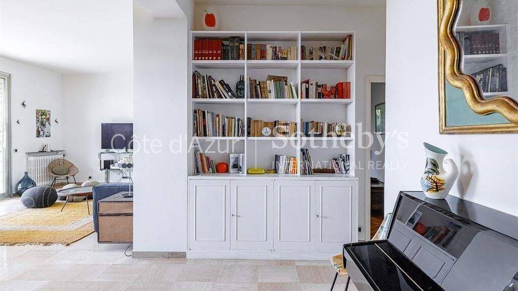 In einer modernen Residenz mit Pool gelegen, besticht diese sorgfältig und nüchtern eingerichtete 90 m² große Wohnung durch zwei große Terrassen, einen privaten Garten von 300 m² und uneingeschränkten Meerblick. Die jüngste Renovierung verbindet zeitgenössisches Design mit künstlerischen Akzenten. Das lichtdurchflutete, südwestlich ausgerichtete Wohnzimmer ist den ganzen Tag über von Licht durchflutet. Dieser Raum mit offener Küche, Kamin und großen Panoramafenstern öffnet sich zu einer 25 m² großen Terrasse mit Meerblick.