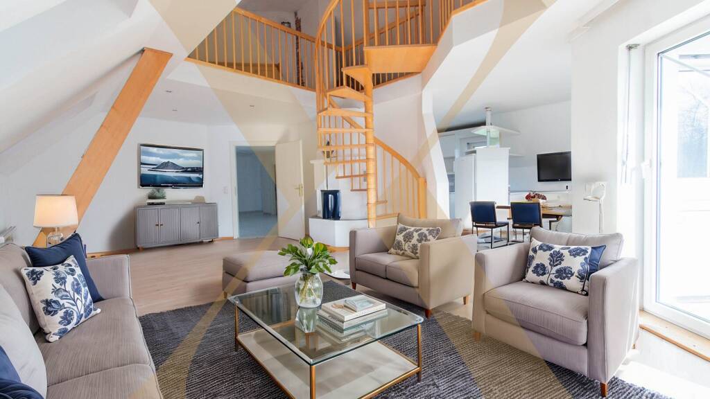 Über eine elegante Treppe im Vorhaus gelangen Sie in das großzügige Obergeschoss mit knapp 172 m², das drei weitere Schlafzimmer, ein Badezimmer im zeitlosen Design, ein WC, eine Garderobe, zwei Abstellräume sowie einen sehr großzügigen Wohn- und Essbereich mit Küche umfasst. Von hier führt eine hölzerne Wendeltreppe weiter zur geräumigen Galerie im Dachgeschoss mit etwa 23 m², die vielseitig nutzbar ist.
