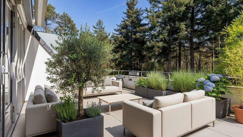 through double french doors, you access the spacious south-facing roof terrace of 28 m². here, you can enjoy the sun all day long and take in the magnificent views across the park. the terrace easily accommodates a large lounge set, dining table and even an outdoor kitchen if desired. an electrically operated awning with wind and rain sensors provides shade when needed.