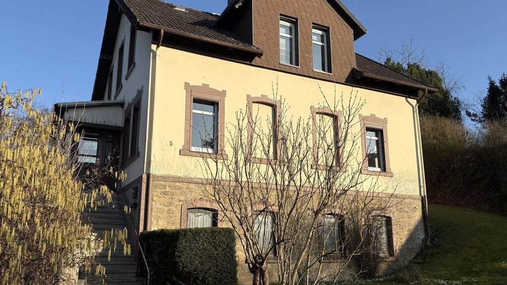 Der repräsentative Hauseingang befindet sich auf der nördlichen Giebelseite und ist über eine lange Treppe erreichbar. Ein großzügiger Erkervorbau unterstreicht den historischen Charakter des Gebäudes. Zusätzlich besteht ein weiterer Zugang über das Kellergeschoss.