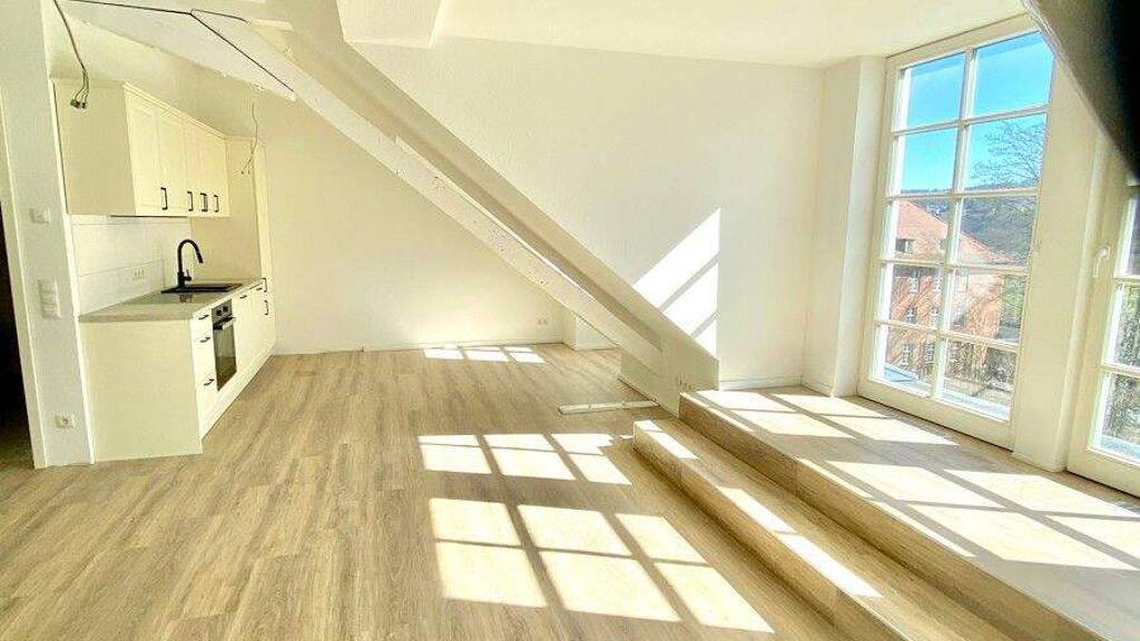 Diese hier angebotene Wohnung mit einer Größe von 67,30 m² liegt im Dachgeschoß und empfängt Sie direkt mit einem WOW-Effekt. Denn Sie stehen nach Öffnen der Wohnungstür inmitten des offen gestalteten Wohn - und Küchenbereiches und haben durch bodentiefe Fensterflächen einen wunderbaren Blick. Auch auf einen kleinen Balkon müssen Sie nicht verzichten. Der Wohnraum wird durch ein eingefügtes Wandelement unterteilt, sodaß auf raffinierte Weise ein separater Schlafbereich geschaffen und gleichzeitig der offene Wohncharakter erhalten bleibt.