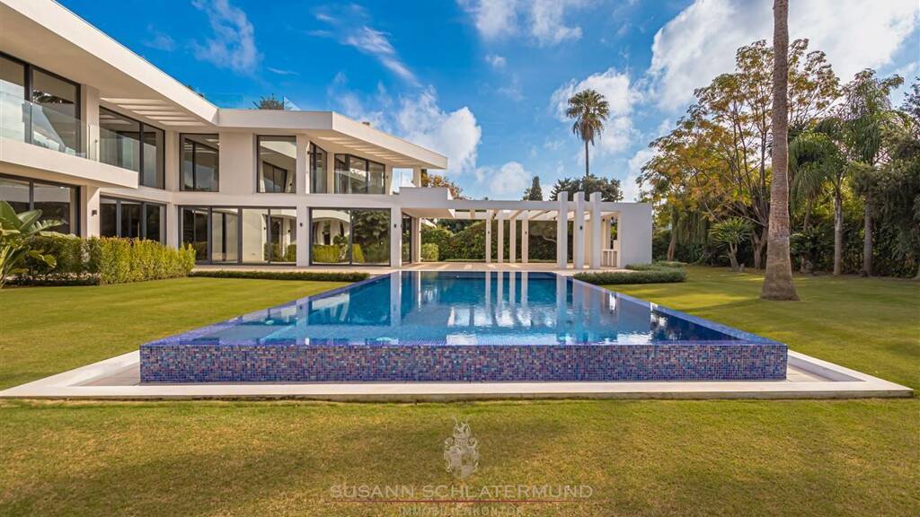 Das 897 m² große, nach Süden ausgerichtete Haus besticht durch seine spektakuläre Architektur, die modernen Stil mit traditionellen mediterranen Elementen verbindet. Es bietet eine wunderschöne Aussicht, eine beeindruckende Innenarchitektur, großzügige Terrassen und einen charmanten Außenbereich mit einem 84 m² großen Pool, einem angelegten Garten, Pergolen und Sitzbereichen, die eine besondere Atmosphäre der Ruhe und Entspannung schaffen. Eine bewegende Oase auf einem über 2.000 m² großen Grundstück empfängt Sie in einem exquisiten Eingangsbereich, der sich zu einem geräumigen Flur mit verglaster Terrasse öffnet. Die elegante, voll ausgestattete Küche mit hochwertigen Geräten führt zu einem großzügigen Wohn- und Essbereich mit raumhohen Fenstern mit Blick auf die Veranda, den Garten und den Pool. Die großen, raumhohen Fenster lassen sich in die Wände zurückklappen und schaffen so eine nahtlose Verschmelzung von Innen- und Außenbereich. Inmitten der gepflegten Gärten steht der imposante Pool im Mittelpunkt und bietet eine idyllische Kulisse für ein erfrischendes Bad an einem warmen Tag. Das spektakuläre Anwesen bietet mehrere Chill-out-Bereiche im Innen- und Außenbereich und sorgt für absolute Entspannung.