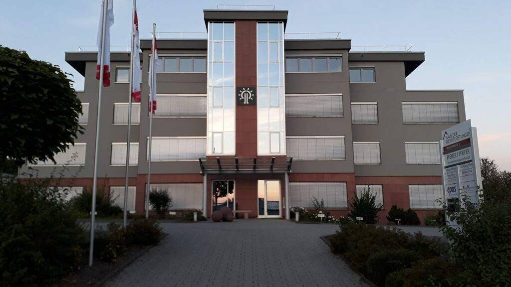Halter für die Aufnahme von Firmenschildern an der Straßenseite (Pylon), an den Haus- und Büroeingängen und für die Parkplätze vorhanden (Schilder mieterseitig)