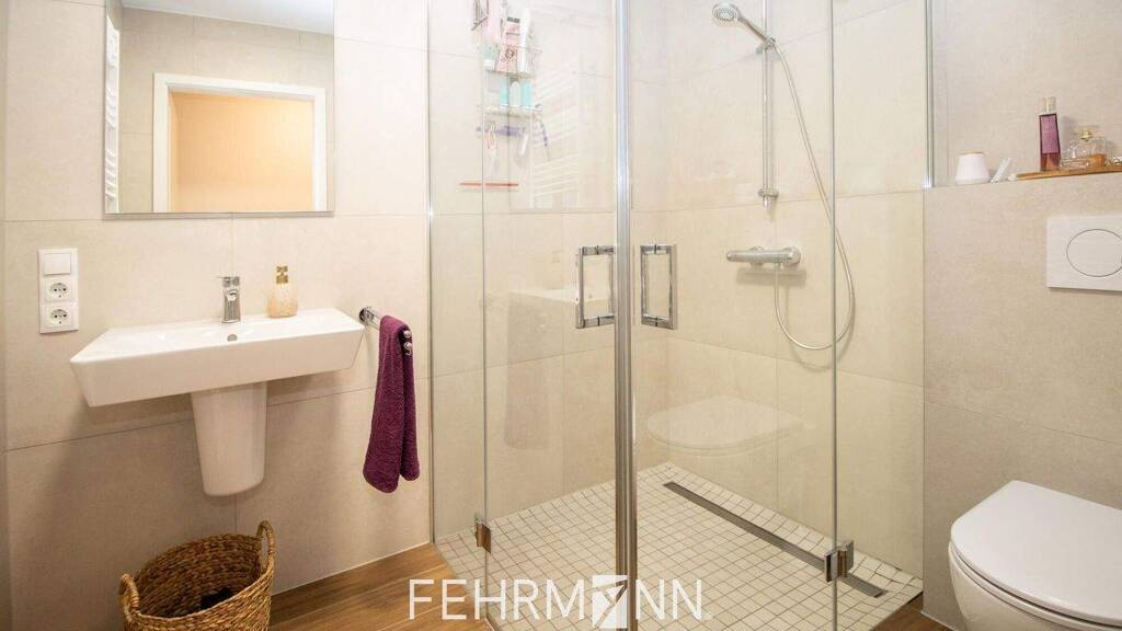 Das Badezimmer ist ebenfalls barrierefrei gestaltet und verfügt über eine ebenerdige Dusche. Ein separater Hauswirtschaftsraum sorgt für zusätzlichen Stauraum und praktische Abstellmöglichkeiten.
