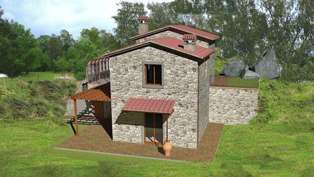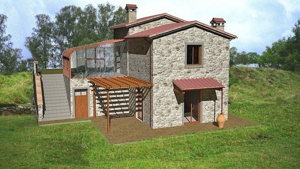 Das zukünftige Haus, vorbehaltlich der erforderlichen Genehmigungen, kann im Panoramabereich des Grundstücks mit herrlichem Blick auf das umliegende Tal errichtet werden. Ein lokaler Architekt hat bereits einen Vorentwurf für ein zweigeschossiges Haus erstellt, der die Möglichkeiten und die Raumaufteilung veranschaulicht. Laut den in der Anzeige enthaltenen Plänen ist eine Wohnfläche von ca. 155 m2 möglich, inklusive Wohnbereich, Keller, Hauswirtschaftsraum und Gewächshaus/Wintergarten. Die Bilder zeigen eine Visualisierung des geplanten Hauses.