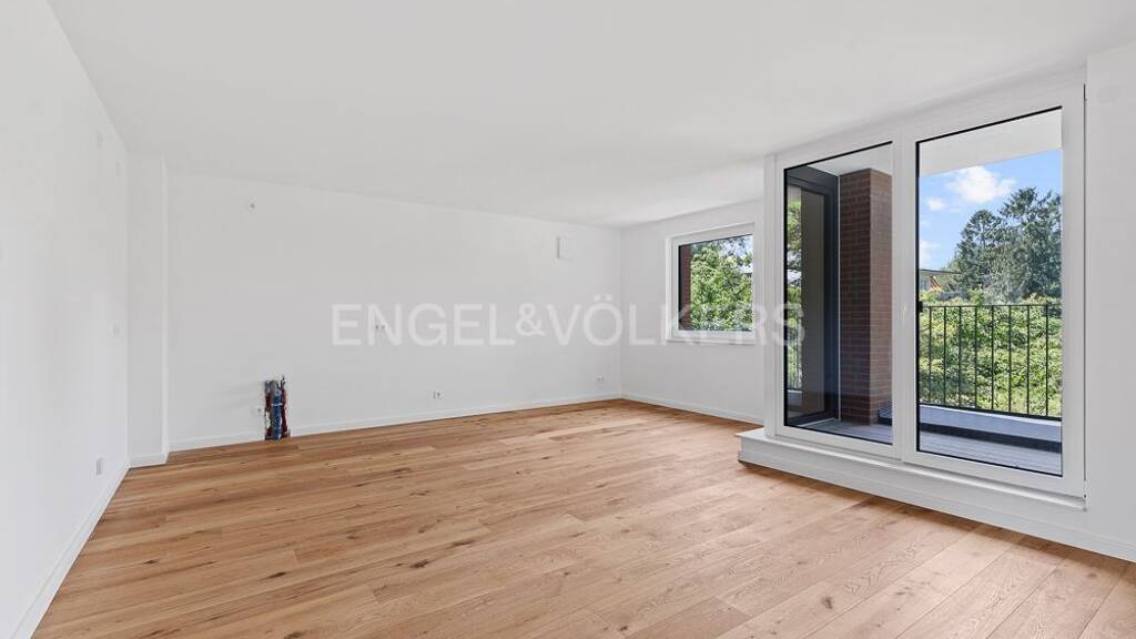 Beim Betreten der Wohnung empfängt Sie ein freundlicher Flur, von dem aus sich linker Hand ein ruhiges Schlafzimmer oder Arbeitszimmer erschließt. Rechter Hand öffnet sich der lichtdurchflutete Wohn- und Essbereich mit bodentiefen Fenstern und einem offenen Grundriss - hier lässt sich eine stilvolle Einbauküche harmonisch integrieren. Von hier aus betreten Sie die geschützte Südwest-Loggia, die - wie auf den Fotos gut zu erkennen - einen sonnigen Rückzugsort mit grünem Ausblick bietet.