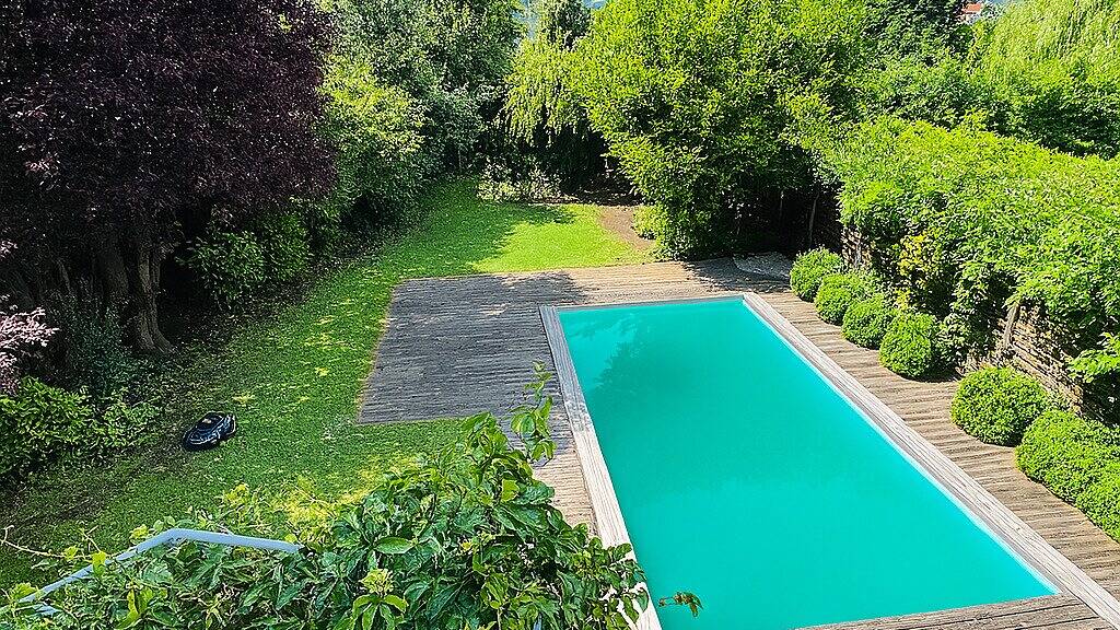 Das Grundstück ist ein echtes Refugium mitten in der Stadt - fast uneinsehbar, herrlich ruhig und mit viel gewachsenem Grün. Ein alter Baumbestand sorgt für natürlichen Schatten, während Rasenflächen und die großzügige Poolanlage (4?×?8?m) zum Verweilen einladen.