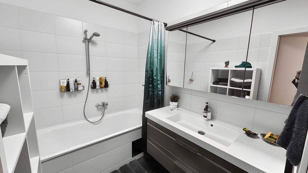 - Bad mit hochwertigem Waschbecken und Spiegelschrank