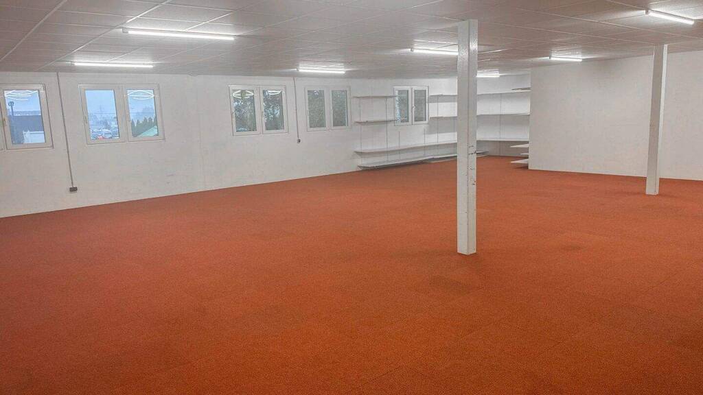 Der Raum überzeugt durch seine großzügige, offene Fläche sowie durch mehrere Fenster, die für viel Tageslicht sorgen und eine angenehme Arbeits- bzw. Präsentationsatmosphäre schaffen.