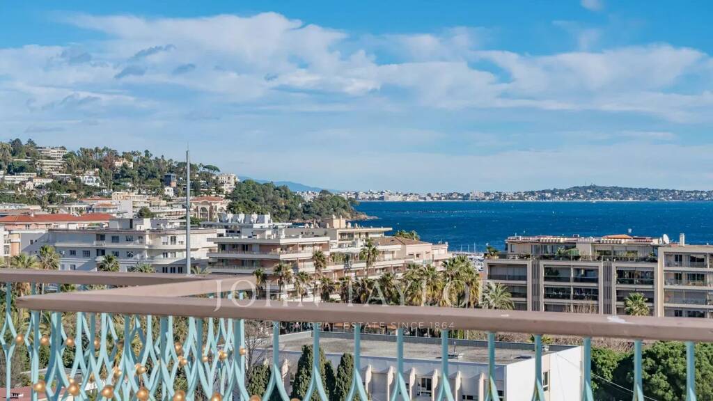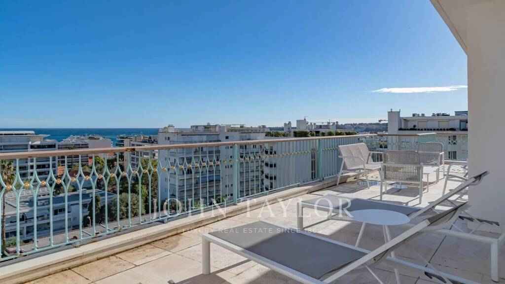 In einer der renommiertesten Residenzen von La Croisette, Sektor Palm Beach - Pointe Croisette, und mit einem herrlichen Blick auf die Bucht von Cannes, wunderschöne zeitgenössische Dachterrasse von ca. 110 m2 Wohnfläche.