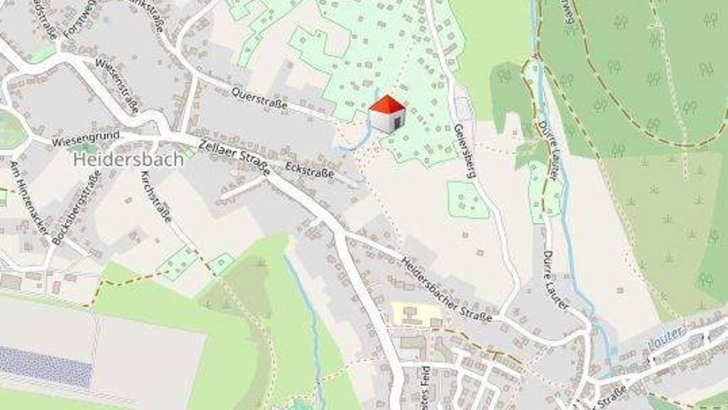Die in unseren Fotos dokumentierte Fläche mit Gebäude, Wagen und Holzhütte befinden sich etwa mittig auf der Luftlinie zwischen dem Goldlauter Schnitzelhaus und der Waldschenke am Geiersberg (50°38'12.7"N 10°44'21.9"E).