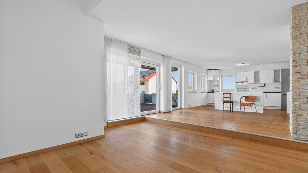 Im Obergeschoss befindet sich eine separate Drei-Zimmer-Wohnung mit eigenem Zugang. Der offene Wohn-, Ess- und Küchenbereich ist hell und freundlich gestaltet, das Badezimmer mit Badewanne, bodentiefer Dusche und WC komfortabel ausgestattet. Der 2014 errichtete Balkon bietet zusätzlichen Platz im Freien, und eine Klimaanlage sorgt für angenehme Temperaturen zu jeder Jahreszeit. Erd- und Obergeschoss lassen sich wahlweise gemeinsam als Einfamilienhaus oder getrennt nutzen.