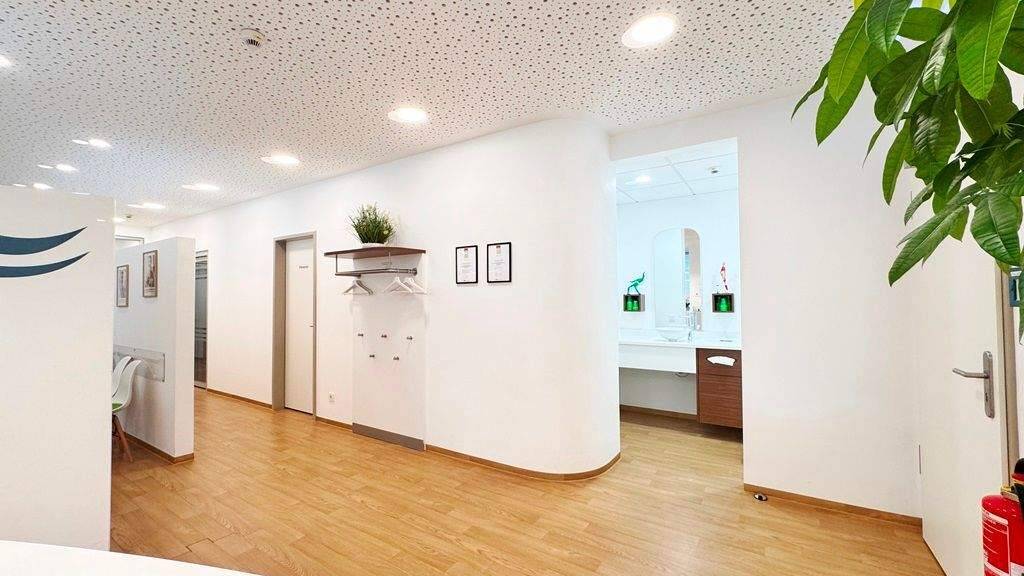 freundlicher und großzügiger Eingangsbereich mit Empfang, Wartebereich, Patienten-WC; Back-Office, vier Behandlungsräume (3 x ca. 9m², 1 x ca. 25m²), Labor, Röntgenraum, kleines Beratungszimmer, Büro, Arztzimmer mit eigenem WC, Teeküche/Personalraum, Personal-WC, Umkleide, Sterilisationsraum, Lager; Kellerraum im Untergeschoss