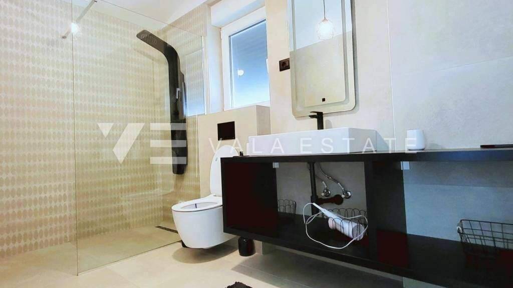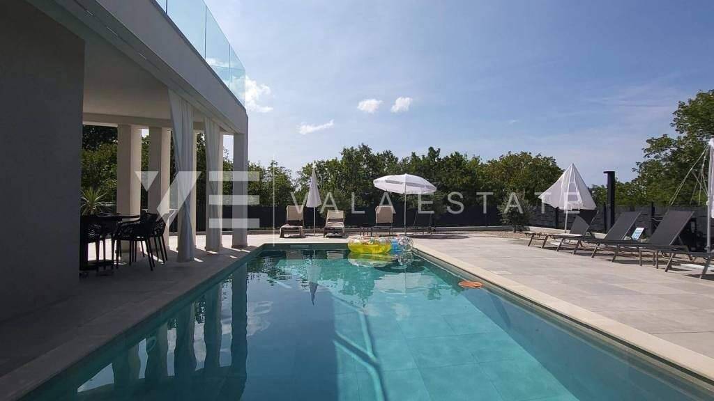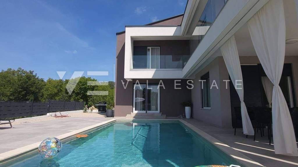 Immobilien auf der Insel Krk, rund um Vrbnik zum Verkauf steht ein neues Einfamilienhaus in ruhiger Lage in der Nähe von Vrbnik am Rande der Grünzone. Es erstreckt sich über zwei Etagen mit insgesamt 175 m2 Wohnfläche. Im Erdgeschoss befinden sich ein Eingangsbereich, ein Abstellraum, eine Toilette, ein Schlafzimmer mit eigenem Bad, eine Küche und ein Essbereich sowie ein großzügiges Wohnzimmer mit Zugang zu einer überdachten Terrasse und Garten. Im ersten Stock gibt es einen Flur, ein Badezimmer, drei Schlafzimmer, von denen zwei über ein eigenes Bad verfügen, und jedes Zimmer hat Zugang zu einer überdachten Terrasse mit Blick auf die umliegende Natur und das Meer. Das Haus ist geschmackvoll mit neuen modernen Möbeln und Elektrogeräten, hochwertigen Bodenbelägen und Sanitäranlagen eingerichtet. Es verfügt über eine Multisplit-Klimaanlage in allen Räumen, elektrische Fußbodenheizung, PVC-Tischlerei, elektrische ALU-Jalousien sowie Alarm- und Videoüberwachung. Auf dem wunderschön angelegten und umzäunten Garten, der Privatsphäre bietet, gibt es einen 30 m2 großen Swimmingpool mit Liegewiese, eine Außendusche, einen Grill und mehrere Parkplätze. Das Haus liegt in ruhiger ländlicher Lage, 5500 m vom Meer und schönen Stränden entfernt. Eine hervorragende Investitionsmöglichkeit für die touristische Vermietung, aber auch für den Eigenheimbau.