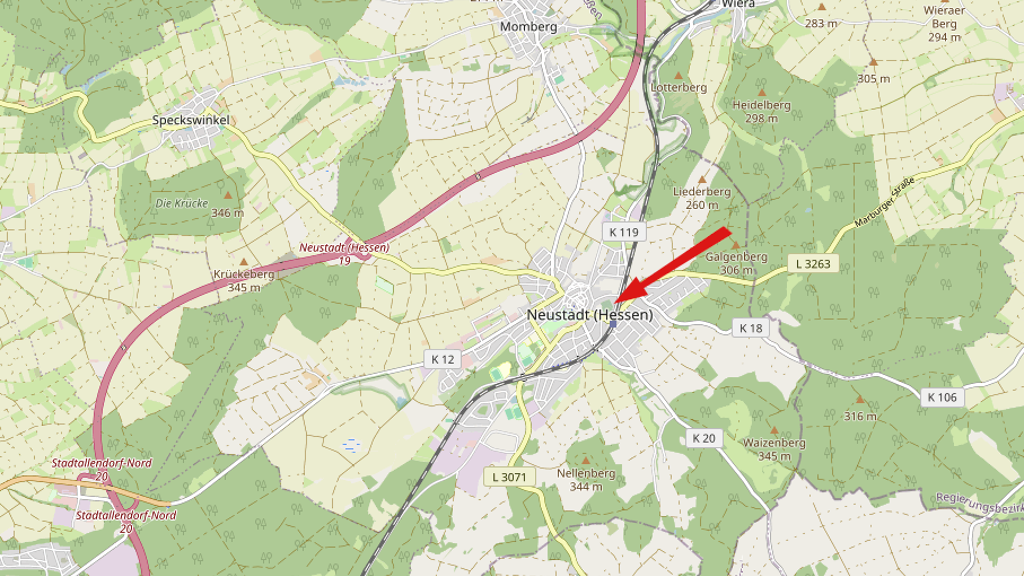 Die Immobilie befindet sich in Neustadt (Hessen), einer verkehrsgünstig gelegenen Kleinstadt im Landkreis Marburg-Biedenkopf mit ausgezeichneter Anbindung in Nord- und Südrichtung. Der fußläufig in etwa einer Minute erreichbare Bahnhof bietet direkte Bahnverbindungen nach Norden in Richtung Kassel sowie nach Süden über Marburg und Gießen bis nach Frankfurt am Main und stellt damit einen wesentlichen Standortvorteil für Berufspendler dar.