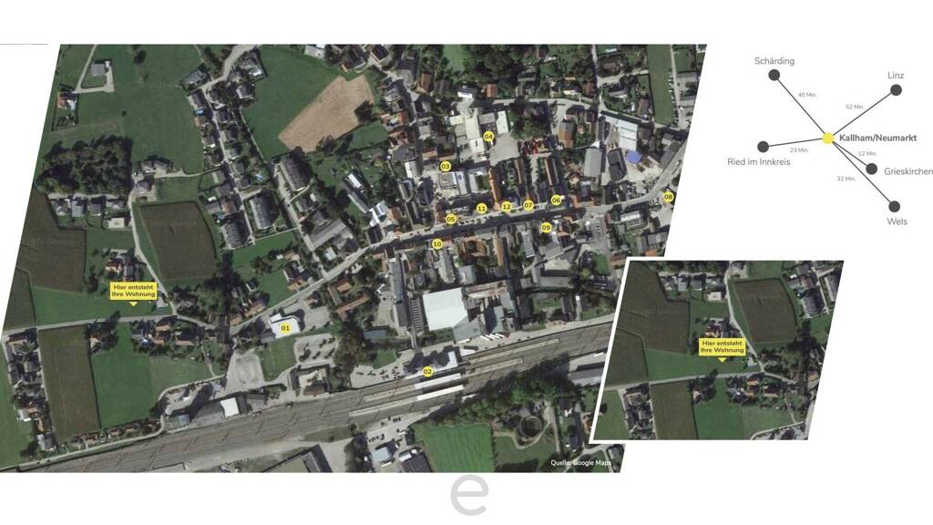 _TOPLAGE:_ Die Kleinwohnanlage liegt im Grünen an einem sonnigen Südhang und trotzdem zentral und nur ca. 300 m vom Marktplatz Neumarkt und ca. 400 m vom Bahnhof Neumarkt-Kallham entfernt. Vilks- und Mittelschule, Lebensmittelgeschäft, Apotheke, Bank und Einrichtungen für ihren täglichen Bedarf befinden sich in unmittelbarer Nähe.