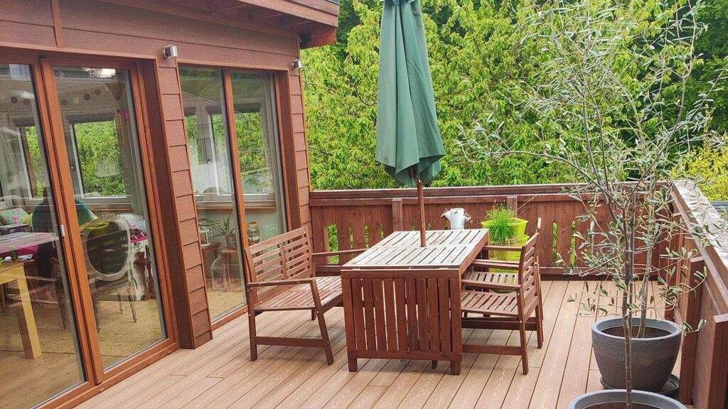Der Wintergarten ist nicht beheizt und gehört nicht zur Wohnfläche. Durch seine gute Isolierung lässt er sich jedoch ganzjährig nutzen. Von hier aus besteht der direkte Zugang zur großen Dachterrasse, die ausschließlich zur Wohnung gehört. Zusätzlich gibt es einen abschließbaren Zugang zur Dachterrasse über das Treppenhaus, was im Alltag sehr praktisch ist.