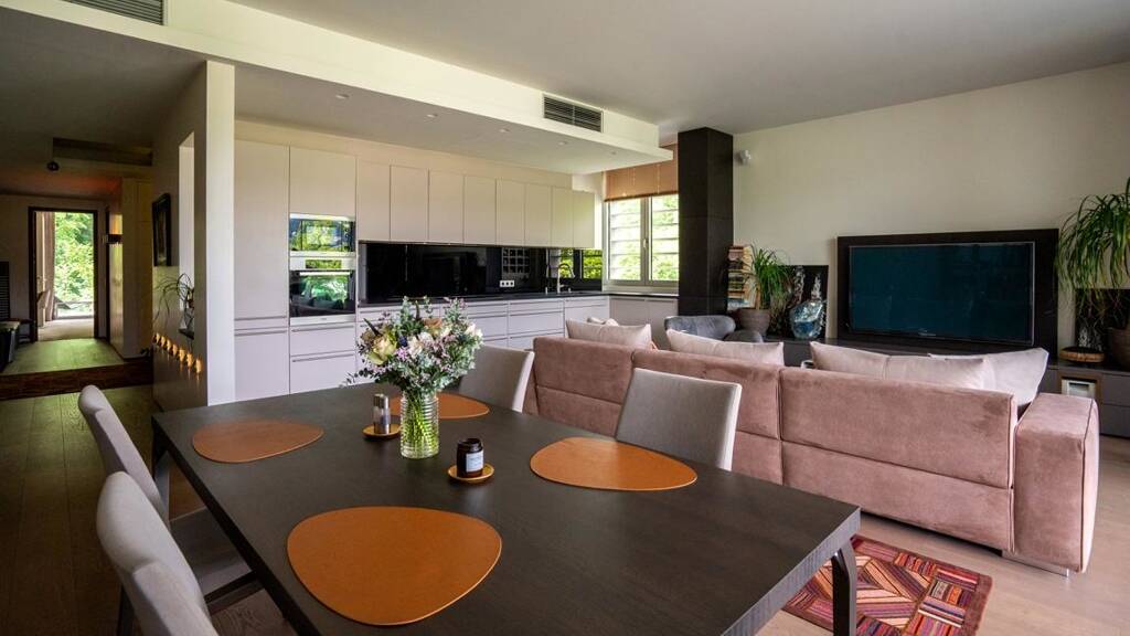 Die Wohnung vereint stilvolles Interieur mit edlen Materialien: Designermöbel, maßgefertigte Tischlerelemente und italienische Qualitätsfliesen schaffen eine Atmosphäre von Eleganz und Wohlgefühl. Die offene Miele-Küche mit gehämmertem Granit sowie das moderne Gira-BUS-System sorgen für zeitgemäßen Wohnkomfort, ergänzt durch eine leistungsstarke Klimaanlage mit FanCoil-System.