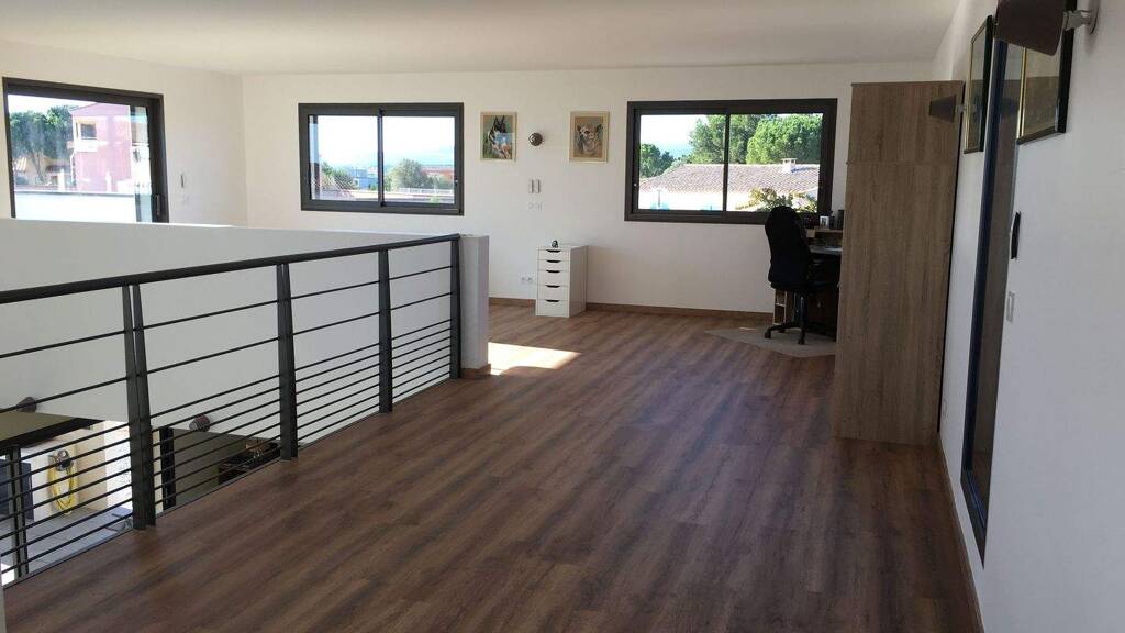 Im Obergeschoss befindet sich ein komfortables Zwischengeschoss mit großem Büro mit Blick auf das Wohnzimmer, das zu 2 zusätzlichen Schlafzimmern umgebaut werden kann.