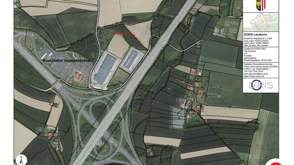 Die Liegenschaft befindet sich direkt entlang der Autobahn in Sattledt und hat eine Gesamtfläche von 24.388 m²