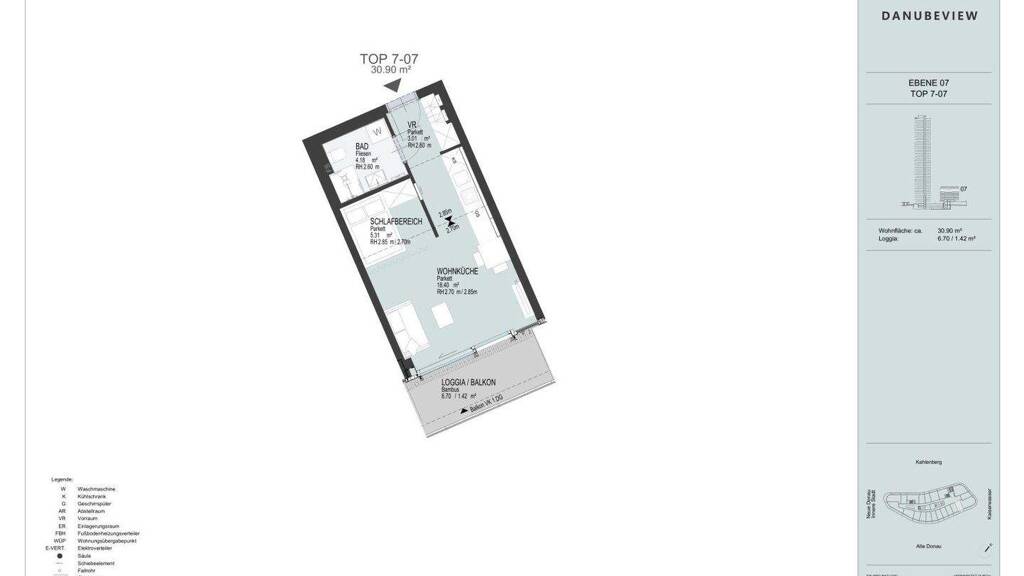 DANUBEVIEW bietet insgesamt 159 Mietwohnungen mit Flächen von 30 m² bis 150 m² und 1 bis 4 Zimmer. Die Grundrisse der Wohnungen gestalten sich offen und lichtdurchflutet. Mit großzügigen Fensterfronten schaffen diese ein freies Raumgefühl mit herrlichem Ausblick auf die Neue Donau und die Wiener Innenstadt. Durchdachte Außenplätze mit einem ansprechenden Landschaftsdesign verbinden sich zum persönliche "art of living" Lebensmittelpunkt. Zusätzlich lassen sich private Arbeitsplätze im Haus anmieten.