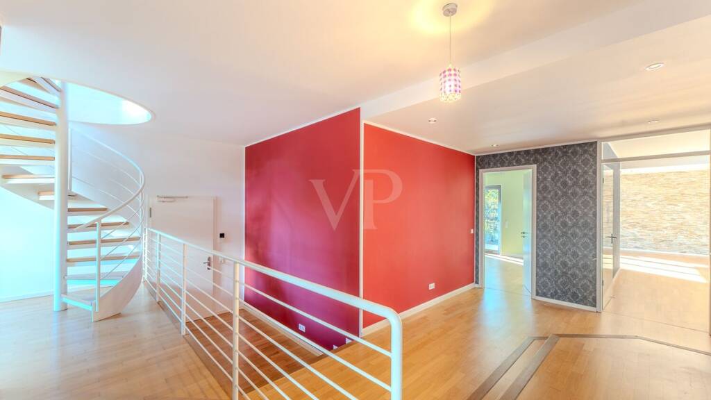 Eine Wendeltreppe verbindet den Eingangsbereich mit der oberen Ebene. Hier befindet sich ein offener Galeriebereich mit Blick auf die Wichertstraße, der sich ideal als Arbeitslounge oder stilvoller Rückzugsort eignet. Über den Flur erreichen Sie ein innenliegendes Badezimmer mit Doppelwaschbecken, Handtuchheizkörper, bodengleicher Dusche und Badewanne sowie eine Abstellkammer mit Anschluss für eine Waschmaschine. Am Ende des Flurs liegen ein weiteres Schlafzimmer und ein zusätzlicher Wohnraum, beide mit Blick ins Grüne und in Richtung Straße.