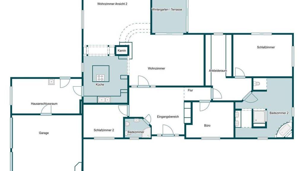 Herzstück des Hauses ist der offen gestaltete Wohn-, Ess- und Kochbereich, der trotz seiner Großzügigkeit charmant in einzelne Zonen gegliedert ist. Ein zentral platzierter Kamin sorgt für zusätzliche Wärme und unterstreicht die wohnliche Atmosphäre, während große Fensterflächen Innen- und Außenbereich harmonisch verbinden. Der Wintergarten mit vollständig zu öffnenden Glasschiebetüren lässt sich in eine überdachte Terrasse verwandeln und erweitert den Wohnraum ideal ins Grüne.