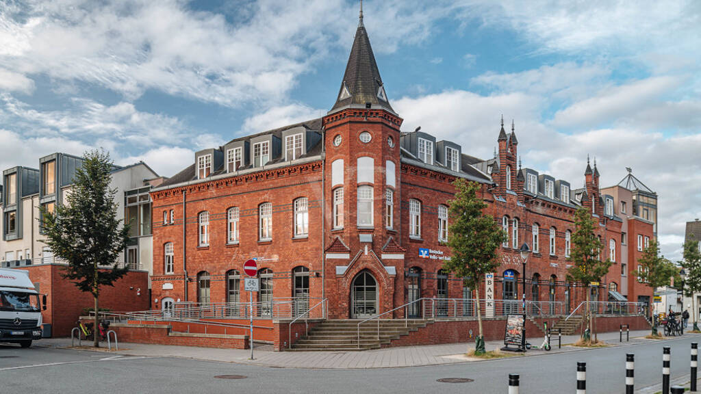 In dem markanten Backsteingebäude befindet sich weiteres Gewerbe darunter eine Poststation und ein Supermarkt.