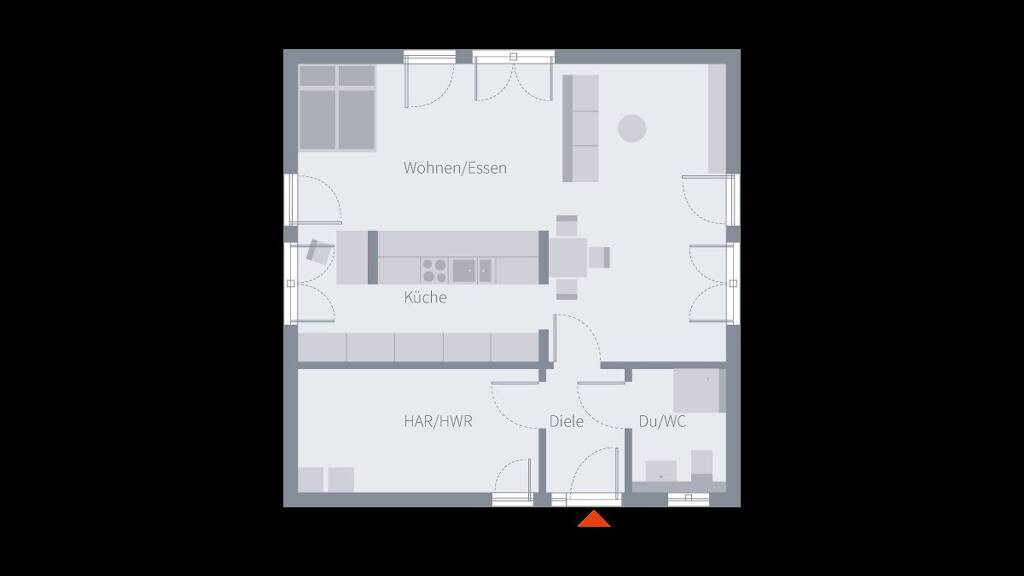 Dass sich Wohnen auf geringer Wohnfläche und ausgezeichneter Komfort nicht ausschließen, zeigt unser Tiny Single Bungalow. Beim durchdachten Wohnkonzept kommen im Besonderen Singles und Paare auf ihre Kosten, die sich auf das Wesentliche konzentrieren möchten und gleichzeitig auf maximale Behaglichkeit setzen. Highlight des Bungalows, der eine Wohnfläche von gerade einmal 73 m² bietet, ist der offene und lichtdurchflutete Wohn-Ess-Bereich sowie die direkt angrenzende Küche. Dank der offenen Aufteilung und der fließenden Grenzen entsteht ein angenehmes Raumgefühl. Das kleine Bad inklusive Dusche und WC passt sich ideal in das Konzept ein und im Hauswirtschaftsraum ist ausreichend Platz für sämtliche Technik vorhanden - für ein modernes Wohnen mit dem MEHR an Komfort. Bodentiefe Fenster schenken dem Wohn-Ess-Bereich nicht nur maximale Helligkeit, sondern ermöglichen ebenso den direkten Zugang zur Terrasse.