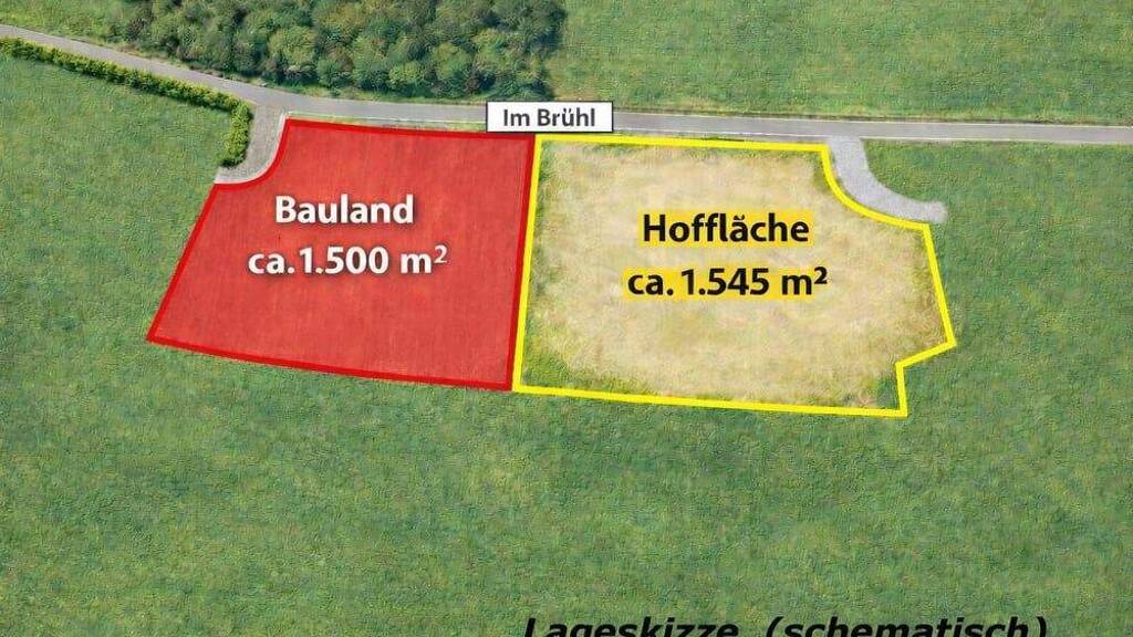 Neben dem Hofgebäude befindet sich eine unbebaute Teilfläche, von ca. 1.500 m², die lt. der Gemeindesatzung zur Ortslage gehört und damit eine Baulücke darstellt. Es handelt sich demnach um Bauland. Als Grün- oder Ackerfläche können für landwirtschaftliche Nutzung noch eine Teilfläche Grünland bis zu 5.000 m² zusätzlich erworben werden.