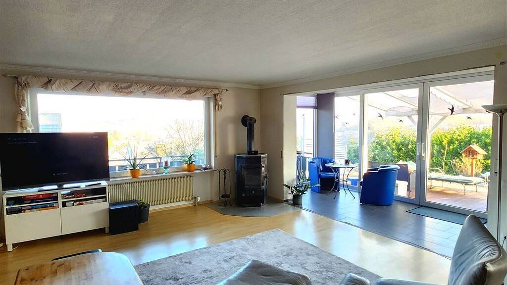 Im Erdgeschoss befindet sich der großzügige Wohn-/Essbereich mit großen Fenstern, die viel Tageslicht hereinlassen inklusive Wintergarten, 2 Zimmer, die Küche mit Einbauküche, ein Badezimmer mit Dusche und Wanne, die Terrasse, der großzügige Eingangsbereich sowie die Treppe zum Dachgeschoss.