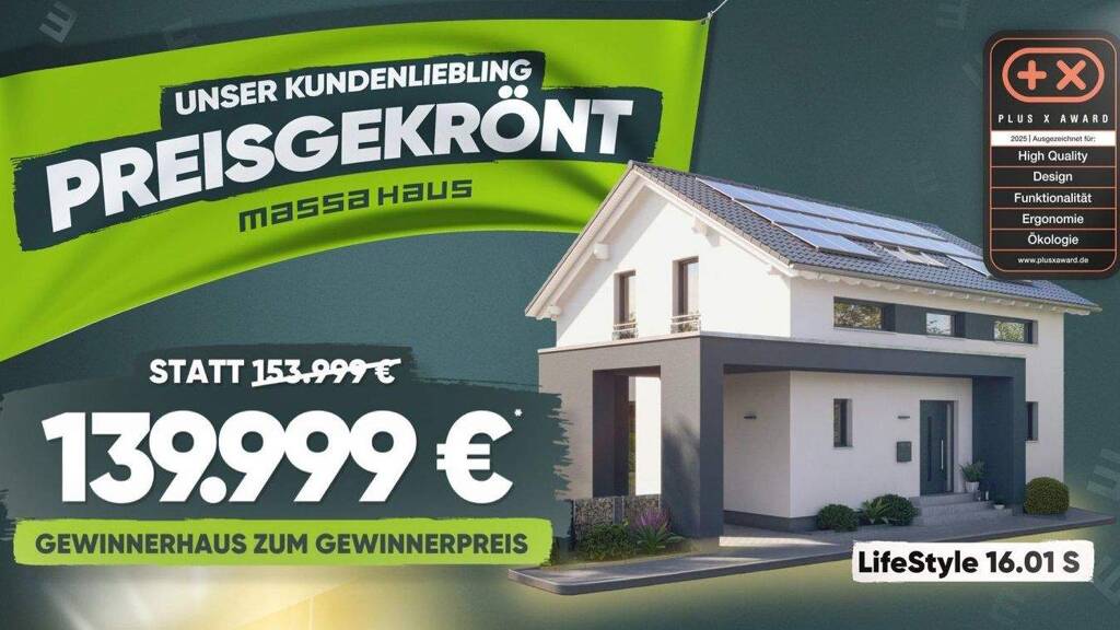 ?? Das LifeStyle 16.01 S von massa haus wurde gleich in fünf Kategorien mit dem PLUS X AWARD ausgezeichnet: High Quality, Design, Funktionalität, Ergonomie und Ökologie. Die Jury überzeugte vor allem das stimmige Gesamtkonzept aus zeitgemäßem Design, hoher Wohnqualität und nachhaltigem Bauen. Denn ein Haus ist mehr als nur vier Wände - es ist Lebensraum, Rückzugsort und eine Investition in die Zukunft.