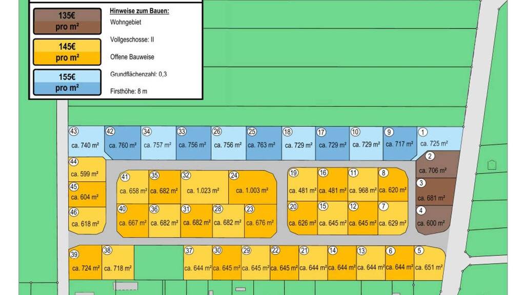 Die Grundstücksgrößen unserer Bauplätze betragen zwischen 481 m² und 1.023 m². Die Kaufpreise liegen zwischen ca. 69.750 € und 148.000 €. Das hier angebotene Grundstück hat eine Gesamtfläche von großzügigen 717 m²...