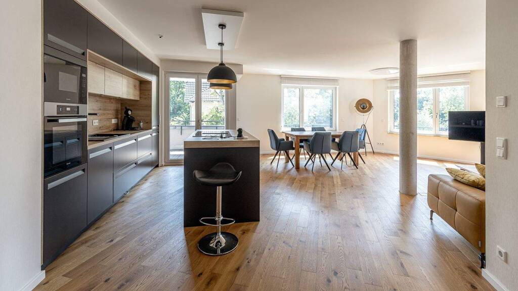 Diese großzügige 4-Zimmer-Wohnung bietet auf ca. 124 m² Wohnfläche höchstem Wohnkomfort und überzeugt durch eine durchdachte Raumaufteilung sowie eine moderne Ausstattung. Der lichtdurchflutete Wohn- und Kochbereich schafft eine einladende Atmosphäre und ermöglicht direkten Zugang zum Balkon, der ideal für entspannte Stunden im Freien genutzt werden kann. Die hochwertige Einbauküche mit Kochinsel stellt das Herzstück der Wohnung dar.