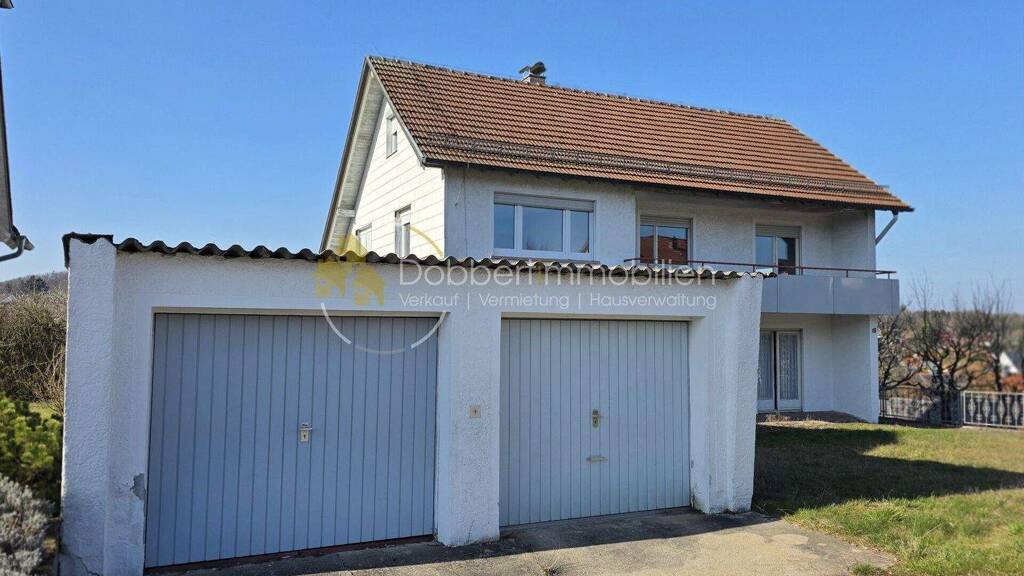 . Grundstücksgröße ca. 1.133 m² . Großer Garten . Zweifamilienhaus mit zwei Wohnungen . Zwei separate Stromzähler . Jeweils 4-Zimmer-Wohnungen mit ca. 82 m² Wohnfläche . Tageslichtbäder in beiden Wohnungen . Separate WCs . Terrasse im Erdgeschoss mit Zugang zum Garten . Balkon im Obergeschoss . Zusätzliche Räume im Dachgeschoss mit weiterem Nutzungspotenzial . Großer Keller mit mehreren Abstellräumen, Hauswirtschaftsraum, Heizungsraum sowie Hobbyraum . Moderne Öl-Zentralheizung . 2 Garagen mit Fenstern, davon eine mit elektrischem Torantrieb, sowie zusätzliche Außenstellplätze davor Garten- und Geräteschuppen mit ca. 30m² . Große Grünfläche vor dem Haus . Ruhige Wohnlage mit weitem Ausblick