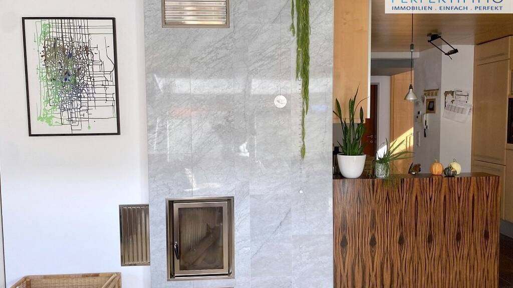Die Wohnung verfügt über einen überdurchschnittlichen Ausstattungsstandard. Im Wohnzimmer sorgt ein stilvoll mit Carrara-Marmor verkleideter Kachelofen für wohlige Wärme und eine besondere Wohnatmosphäre, während die Öl-Zentralheizung mit Wandheizkörpern und ein Warmwasserboiler im Abstellraum für zusätzliche Versorgungssicherheit stehen. Kunststofffenster mit Doppelverglasung, Plissees an allen Fenstern sowie Raffrollos im Schlafzimmer unterstreichen den hochwertigen Charakter. Hochwertige Holztüren mit grauem Metall-Türstock und eine praktische Sonnenmarkise auf der Terrasse runden das Bild ab.