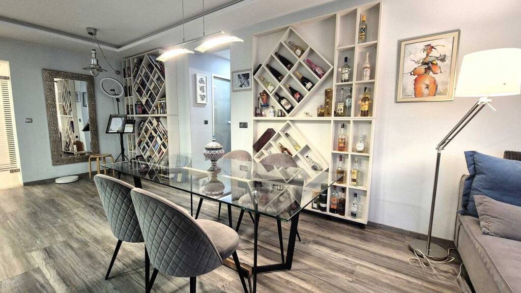 ein geräumiges Wohnzimmer, das einen gemütlichen Entspannungsbereich, ein elegantes Esszimmer und eine voll ausgestattete moderne Inselküche vereint. Der Raum ist mit Liebe zum Detail, natürlichen Materialien und interessanten Akzenten gebaut, die dem Interieur Charakter und Seele verleihen.