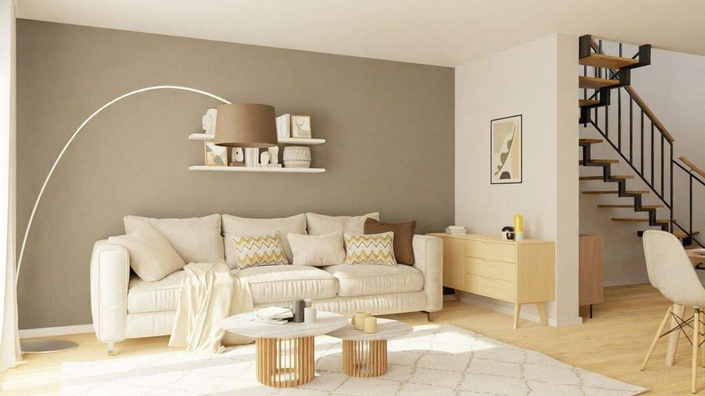 Willkommen in Ihrem neuen Reihenhaus. Im Erdgeschoss erwartet Sie ein gemütliches Arbeitszimmer, ideal für Homeoffice. Die geräumige Diele führt zu einem Kinderzimmer, das viel Platz zum Spielen bietet. Der Wohnbereich im Untergeschoss ist offen gestaltet und lädt zum Entspannen ein. Die moderne Küche ist perfekt für gemeinsame Kochabende. Zwei weitere Schlafzimmer und ein Badezimmer im Obergeschoss bieten Komfort und Rückzugsmöglichkeiten. Abgerundet wird das Haus durch eine praktische Abstellfläche im Dachgeschoss.