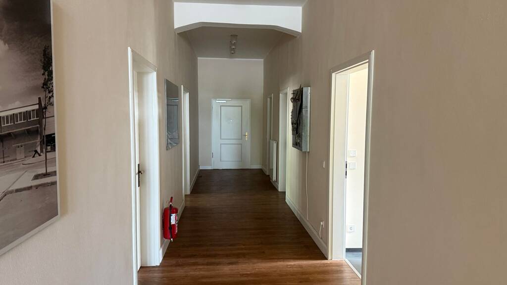 Die zur Verfügung stehende Einheit erstreckt sich über eine Fläche von insgesamt 264 m² und bietet sieben helle, großzügig geschnittene Büroräume mit jeweils rund 22 Quadratmetern. Ergänzt wird die Fläche durch eine gut ausgestattete Teeküche, einen separaten Serverraum, zwei getrennte WCs sowie einen einladenden Wartebereich im Flur. Der Grundriss überzeugt durch seine Großzügigkeit und Klarheit: Alle Büros sind über den repräsentativen, breiten Flur zugänglich, der mit seiner historischen Atmosphäre ein besonderes Ambiente schafft.