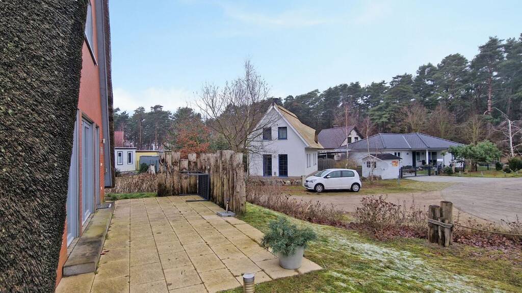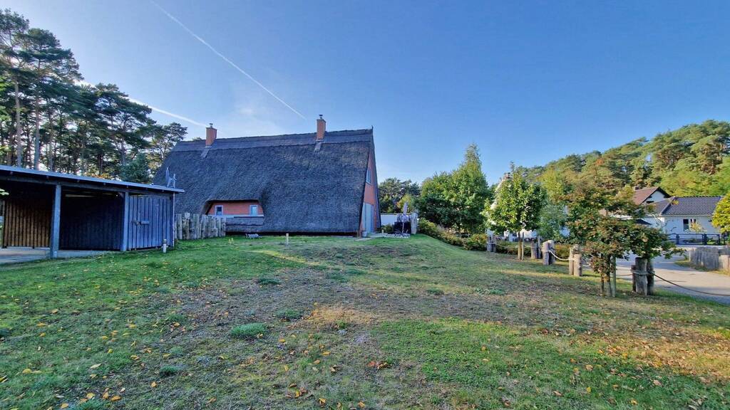 Die reetgedeckte Doppelhaushälfte bietet ein ideales Domizil für den Urlaub mit der Familie. Auf ca. 83 m² Wohnfläche verfügt das möblierte Ferienhaus über ein großzügiges und helles Wohnzimmer mit einem Kaminofen, welcher an den kälteren Tagen einen behagliche Wärme sorgt. Die offen gestaltete Küche ist mit einer modernen Einbauküche und mit allen notwendigen Geräten (Geschirrspüler, Herd/Backofen, Mikrowelle, Spüle und Kühlschrank) ausgestattet. Der angrenzende Essbereich bietet Platz für bis zu 6 Personen. Zur Verfügung stehen im Erdgeschoss noch ein Abstellraum und das hell gestaltetes Tageslicht-Bad. Dieses ist mit einer bodengleichen Dusche, einer Infrarot-Sauna und einer Waschmaschine ausgestattet. Die Fenster im Erdgeschoss verfügen über Rollläden und die großzügige Terrasse lädt ideal zum Entspannen ein. Über den Flur erfolgt der Zugang zum Dachgeschoss. Hier befinden sich das Schlafzimmer, das große Kinderzimmer und ein Gäste-WC. Die beiden Schlafzimmer sind mit einem Doppelbett bzw. zwei Einzelbetten ausgestattet. Die Schränke bieten viel Stauraum für die Kleidung.