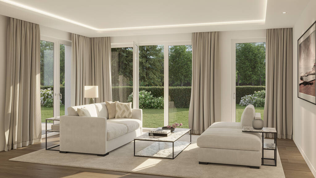 Die beeindruckende Gartenwohnung erstreckt sich mit einer Wohnfläche von ca. 185 qm über 4 großzügige Zimmer und einen direkt verbundenen Souterrainbereich, welcher in der gleichen hochwertigen Ausstattungsqualität ausgebildet wird wie sämtliche Räume der Wohnung. Bestens belichtet durch zahlreiche bodentiefe Fenstertüren. Alle ausgestattet mit elektrischen Rollläden. Aus jedem der Zimmer kann man in den umlaufenden eigenen Garten treten. Eine gut dimensionierte Südterrasse grenzt an den ca. 40 qm großen Wohn-/Essbereich. Familienfreundlich geplant, verfügt diese Wohnung über drei gut geschnittene Bäder.