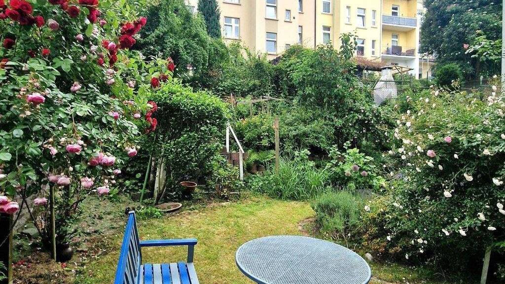 Der rückwärtige Garten ist überschaubar, mit einem kleinen Hangabschluss und einer sehr hübschen, vielfältigen Bepflanzung und Platz für Sitzgelegenheiten und steht der Hausgemeinschaft zur Nutzung zur Verfügung.