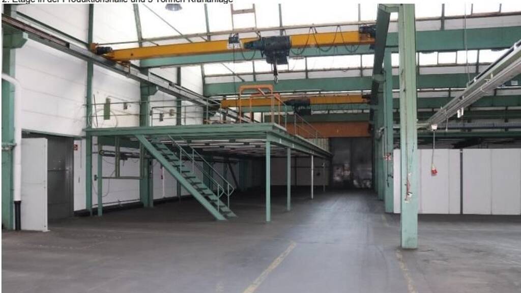 Zur Ausstattung gehört eine Krananlage (5 Tonnen). Parkplätze befinden sich auf dem Grundstück. Die Hallen sind beheizbar. Die Halle eignet sich für Produktion oder Lager. Es stehen außerdem noch asphaltierte Hofflächen zur Verfügung.