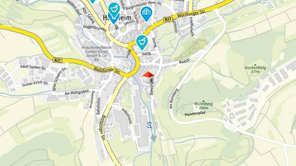 Die Wohnanlage befindet sich in unmittelbarer Nähe zum Ortskern von Hardheim - dieser ist bequem in wenigen Minuten fußläufig erreichbar. Direkt an das Grundstück grenzt die Erfa, ein idyllischer Nebenfluss des Mains, der nicht nur der Region ihren Namen verleiht, sondern dem Ensemble auch eine besonders grüne, ruhige Wohnatmosphäre verleiht.