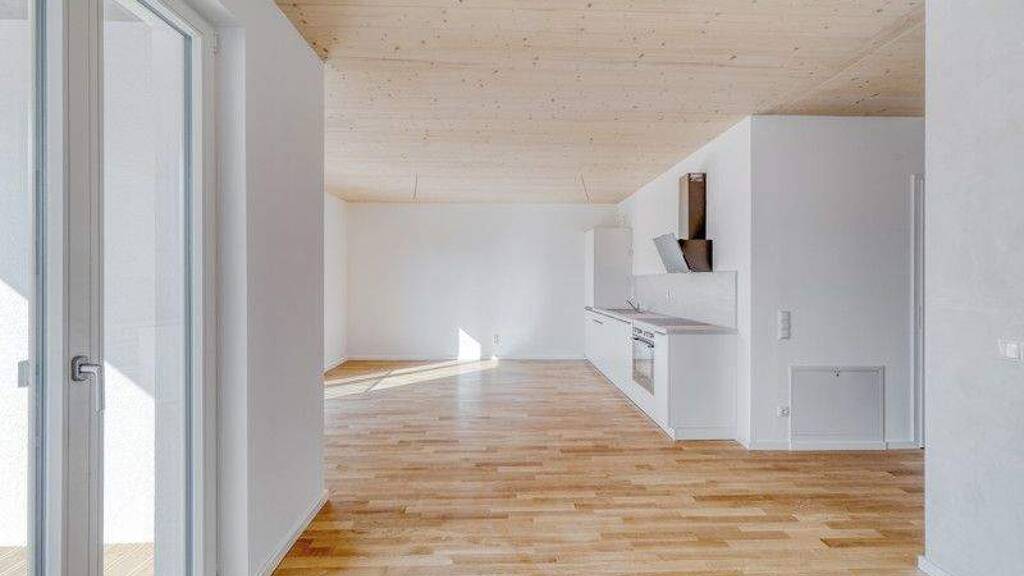 Die elegante Einbauküche ist nahtlos in den Wohnraum integriert und bietet alles, was man für den Alltag braucht. Echtholzparkett, eine edle Holzdecke und eine angenehme Fußbodenheizung schaffen eine behagliche Atmosphäre mit natürlichem Charme. Der sonnige Balkon erweitert den Wohnraum ins Freie und lädt zum Entspannen ein.